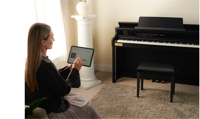 专用应用程序“CASIO MUSIC SPACE”配备直观的“遥控器”功能,通过图形UI用户界面进行直观地操作。通过附带的蓝牙MIDI和音频适配器或USB连接线连接,可以轻松设置和远程操作电钢琴,这对于一些效果微调或者需要调整多个参数时非常方便。此外,应用程序内置有古典名曲和练习曲的乐谱,并且可以在乐谱上进行批注。您还可以使用“现场音乐会模拟”功能,在演奏的同时播放收录的管弦乐队现场生动逼真的伴奏,仿佛在进行合奏共演一样。此外,音乐会演奏的曲目可以播放、暂停、快进、快退、A-B区段重复等操作。您还可以降低播放速度,使困难的曲目更容易练习。
