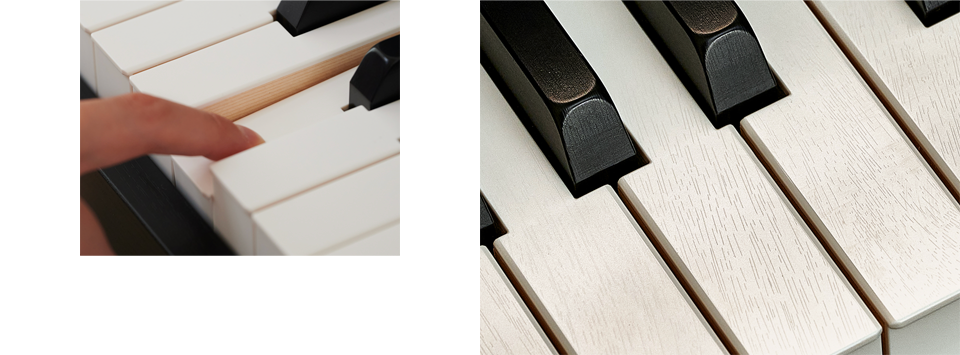 白键采用木塑混合材质,由树脂和三角钢琴键盘中经常使用的云杉木混合制成。此外,对于琴键表面处理上也有巧思,白键还原自然的象牙质感,黑键则更具乌木的外观和纹理。这种材质不仅可以还原三角钢琴般自然键盘触感,还可以享受高演奏性能,既时尚又具有豪华质感。