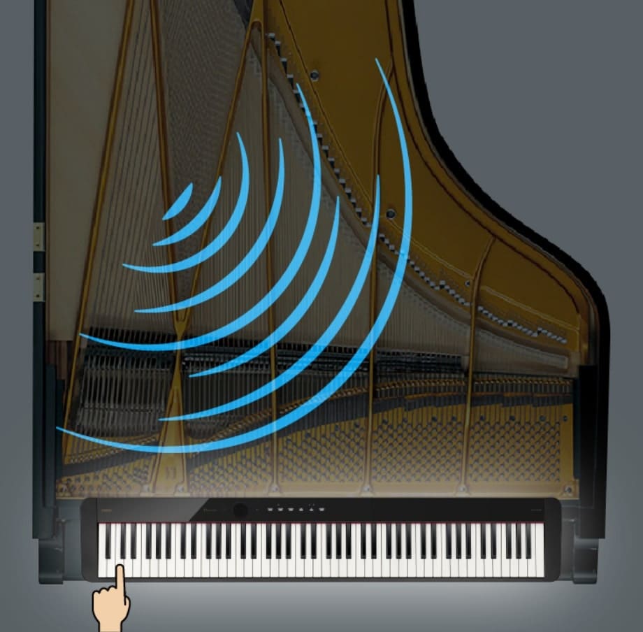 原声三角钢琴产生的丰富共鸣是庞大琴身内部复杂构造和泛音结构变化共同作用的结果,泛音结构的变化来源于钢琴中约230根琴弦依照演奏者演奏方式、乐句划分和踏板使用情况所产生的共鸣。卡西欧的专利技术——多维图像处理AiR音源在发出自然且浑厚的三角钢琴音色的同时也不忘打磨细节,带来不同寻常的演奏效果。