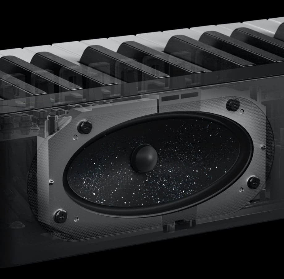 扬声器振膜的尺寸大小充分利用空间,从而获得强劲有力的声音。Privia系列PX-S1100/PX-S3100/PX-5000扬声器的振膜中加入了“云母”,这是一种许多高端音频产品中会使用的增强材料,用以实现更细致的高频。此外,扬声器的内部结构允许大范围的音圈运动,从而增加声量,同时产生更丰富、更嘹亮的低频音。简而言之,演奏者演奏时的细微差别都会如实反映在声音中。