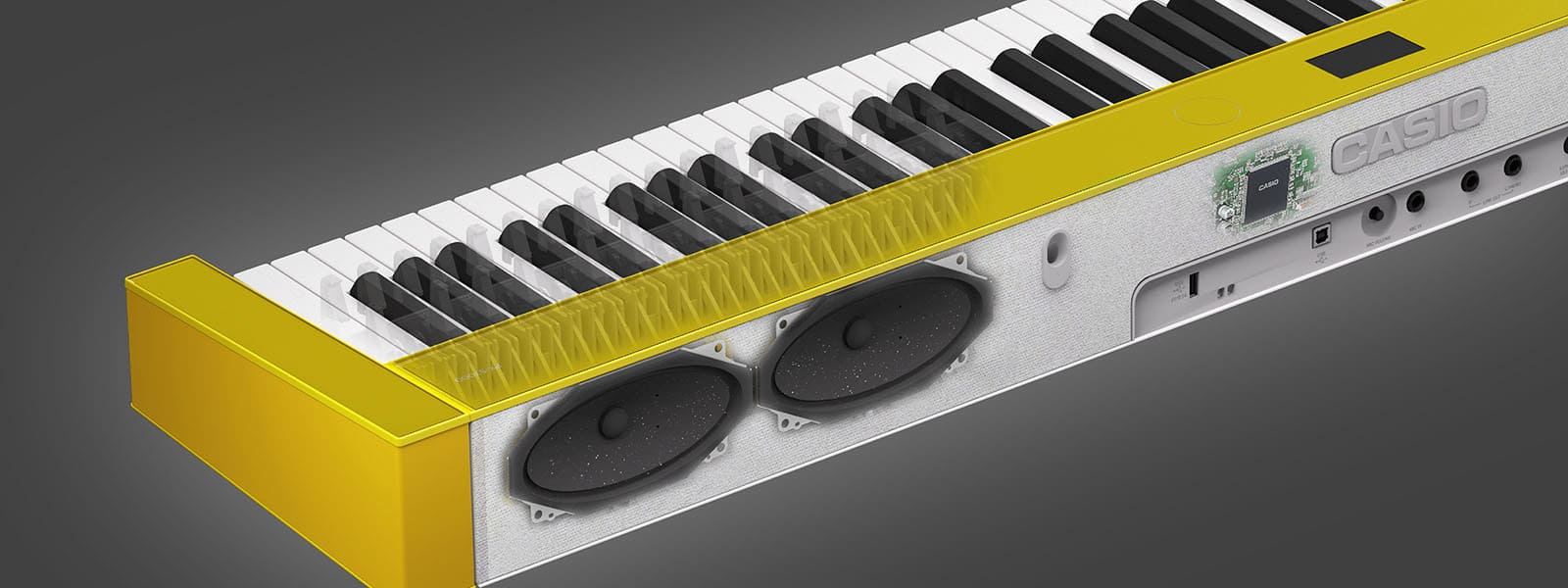 凭借卡西欧的高密度封装技术,实现键盘的小型化,特点在于垂直安装电路板,使钢琴的内部结构占用空间更少——实现摆放与弹奏自由。操作面板采用LED触控按钮,不但减少了物理开关和按钮数量,还可以轻松调整设置,实现整体的时尚简约。同时保持一种干净利落的美感,增加了与周围室内环境的和谐感。