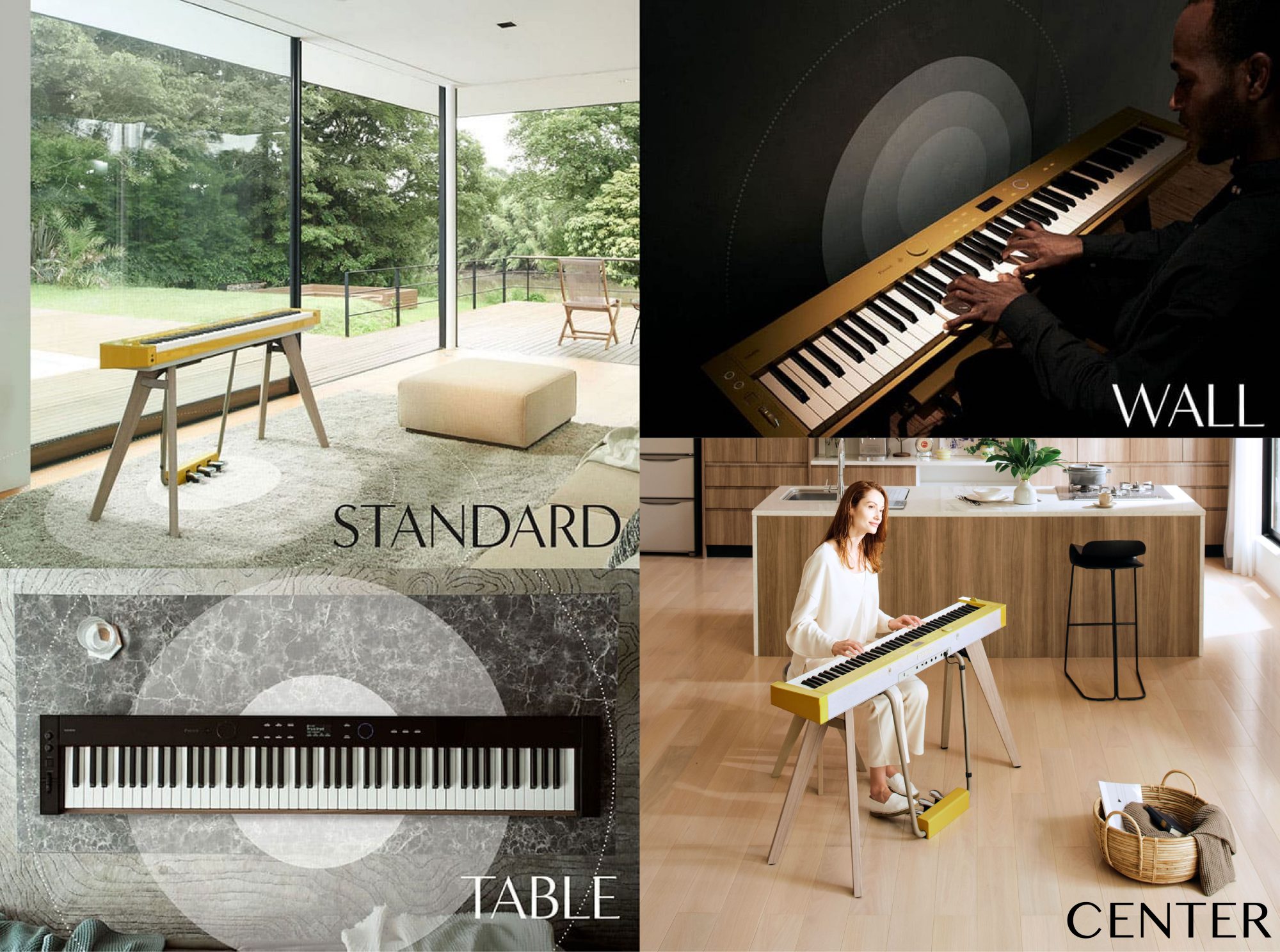 空间音响系统的钢琴定位功能可用于调整音响效果,便于您根据产品的摆放位置调整四个扬声器发出的声音,让您在自己心仪的地方弹奏,享受随处可弹的自由感!共有四种模式供您挑选。第一种是标准(一般)模式,顾名思义,即默认、常见的设置,适用于在琴架上弹奏。第二种是墙壁模式,适用于背靠墙壁弹奏。靠墙弹奏时,低音范围变弱,而且墙面的反射声会造成频率干扰。声音从左向右渐小,因为声音往往集中在中央,所以墙壁模式可以补偿这种损失。这是PX-S6000/PX-S7000四台扬声器一起使用此设置模式时,即使靠墙演奏,声音也会经过校准,呈现良好的弹奏体验。中央模式适用于在房间或人群中央弹奏时使用。钢琴放置在房间中央时,来自周围的反射声会减少,因此很难感觉到更高音域以及左右传播。中央模式能通过调整音质弥补这一缺点,从背后聆听的效果也能得到提升。最后一种模式是桌面模式,可以校准置于桌子上时,桌面回音引起的频率干扰。这四种钢琴定位模式能为您带来不同的自由演奏体验,无论在房间的哪个地方弹奏,都可以实现高品质音质体验!
