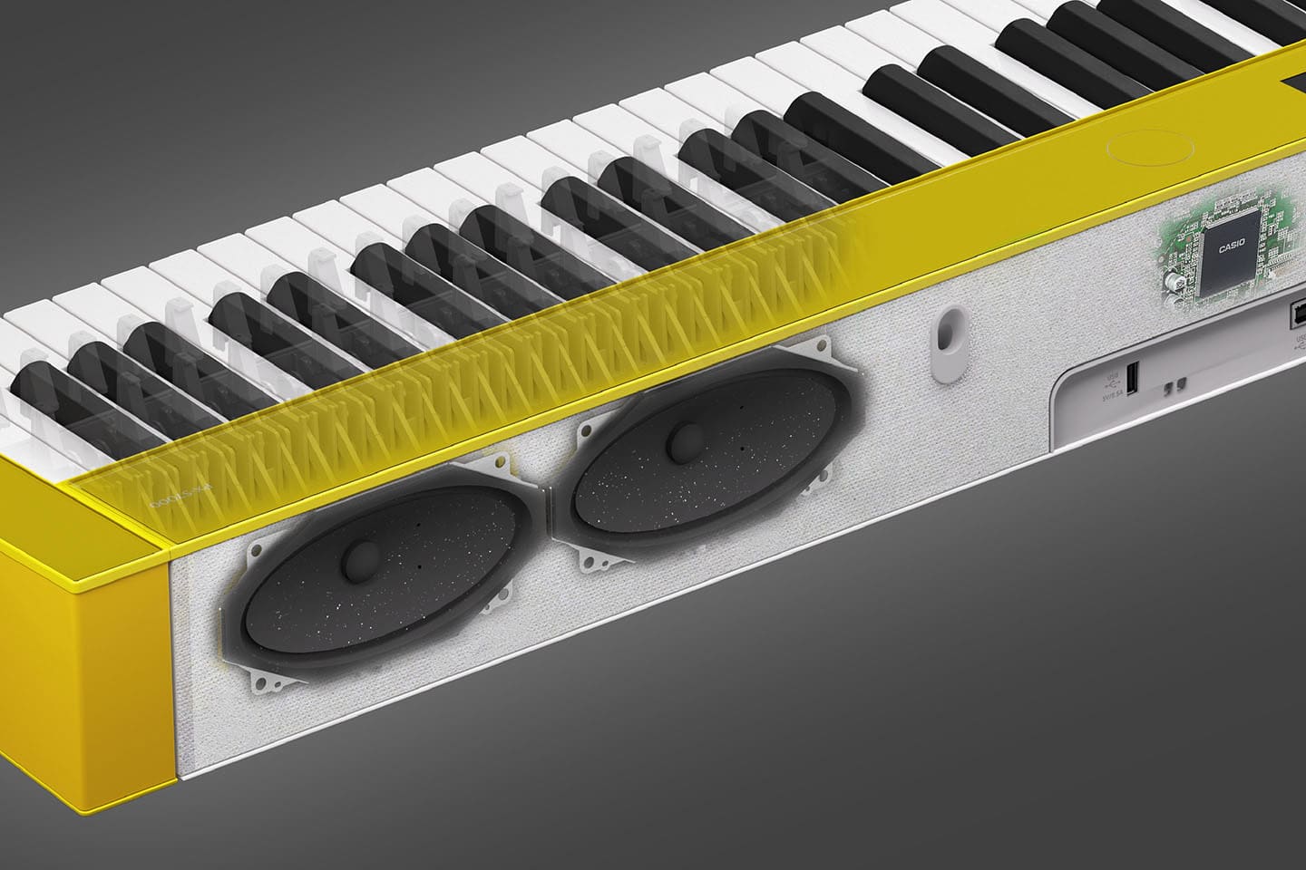 扬声器振膜的尺寸大小充分利用箱体有限的空间,凸显出音色强劲有力的一面。Privia系列PX-S7000和PX-S6000扬声器的振膜均加入了“云母”,这是一种许多高端音频产品都会使用的增强材料,用以实现更细致的高频。此外,扬声器的内部结构可允许大范围的音圈运动,从而增加声量,同时产生更丰富、更嘹亮的低频音。简而言之,弹奏者弹奏时的每一个细微差别都会如实反映在声音中,使弹奏更加自由。