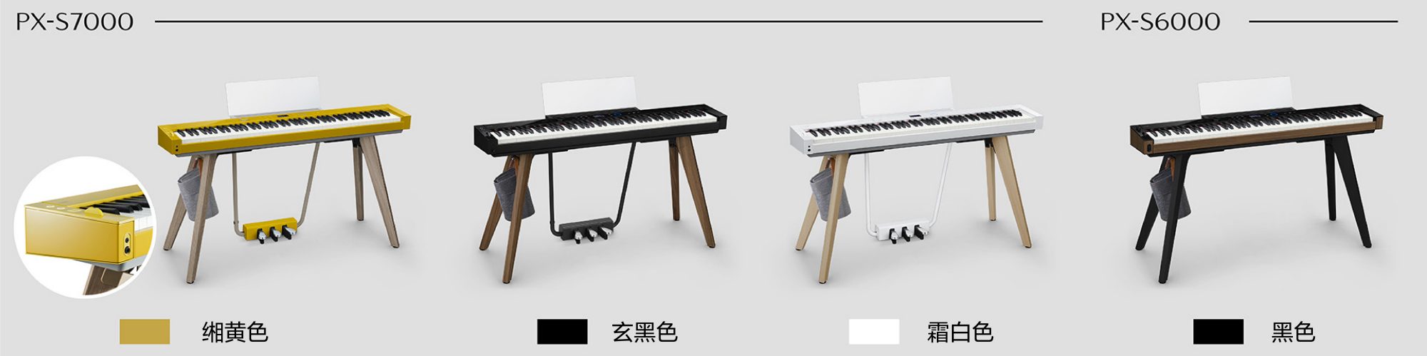 琴身配色也决定了设计能否与生活空间和谐融合。PX-S7000共有3种颜色供您选择:经典玄黑色、霜白色以及一种独特的新色调,我们喜欢称之为“缃黄色”*。“缃黄色”是一种非常特别的颜色,鲜少用于钢琴。我们深入研究当今欧洲的室内设计趋势之后,开发出了这种优雅温暖,能自然融入各种时尚生活空间的颜色。“缃黄色”还采用三角钢琴风格的烤漆亮面,像其它精心挑选的家具一样,能进一步凸显奢华时尚之感。PX-S7000采用一体式木纹式样琴架,而PX-S6000则采用复合设计,琴头可单独使用或搭配黑色琴架使用(单独出售)。琴身颜色结合了亮黑色与部分胡桃木纹纹饰,与黑色琴架相得益彰,可和谐融入各种室内空间。设计理念尊重您的生活风格,扬声器织物网罩、琴架和毛毡琴罩(PX-S6000单独出售)均经过精心设计,金属框架(仅限PX-S7000)则与每个颜色保持一致。