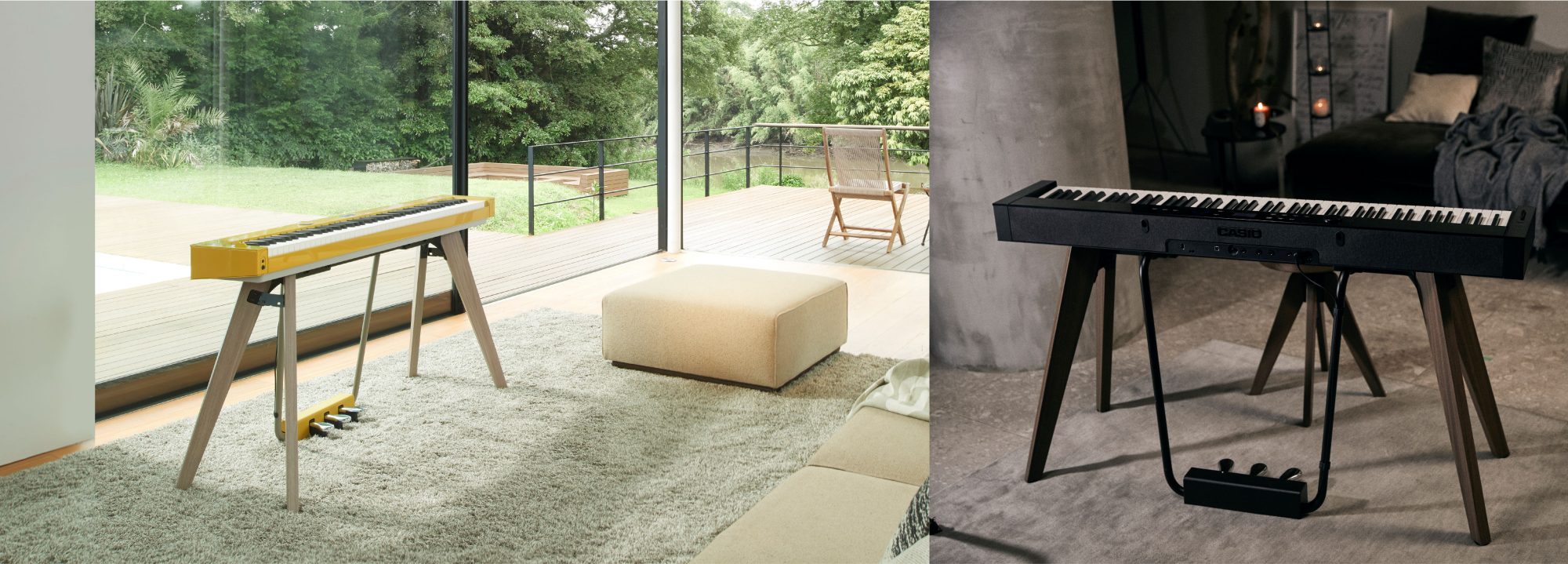 我们旨在使用全新的设计风格,采用现代极简理念,专注打造简约的直线线条,消除传统钢琴的传统曲线和笨重感。两种型号均采用现代直线设计理念,包含纤薄的琴身、扬声器网罩的织物面料设计以及透明乐谱架。两者的主要区别在于:PX-S7000采用木制家居风格设计的一体式琴架和踏板,赋予传统三角钢琴般的美感。以金属框架连接琴身与踏板,稳定性极佳,并配有时尚毛毡琴罩。PX-S6000采用复合设计,琴身采用木纹饰面材质,无论置于何处都不失美感,也可搭配单独出售的黑色琴架和毛毡琴罩使用。PX-S6000/PX-S7000的设计旨在融入各种生活方式和环境。传统钢琴一般需要靠墙摆放,因此不见其背。但为了更好地融入您的生活,便于您在室内各个角落随时演奏,我们精心设计了PX-S6000/PX-S7000,360°优美外观可和谐融入不同的生活环境。