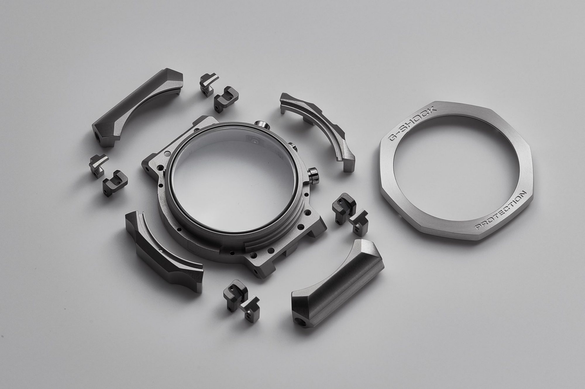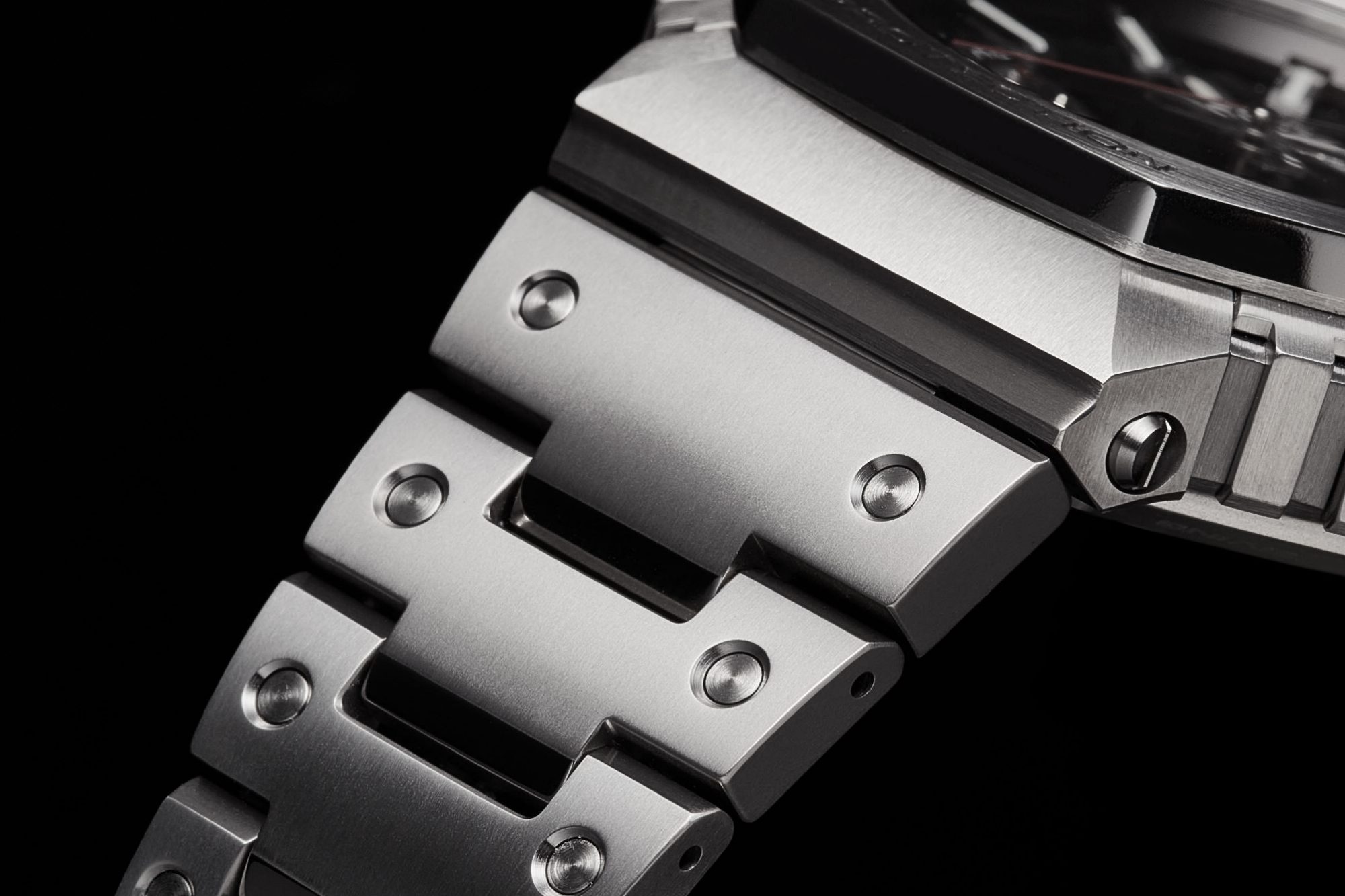 对这种高级质感做出贡献的是,MRG-B5000和前作MRG-B2100B都采用的外装细分化设计。如表壳四角的凹凸区域,在一体成型下难以被抛光。但通过将表圈分成27个零部件,就可以进行彻底的抛光,并且通过零部件的细分化结构确保其耐冲击性。此外,在表带上也能看到初代产品中为大众所熟悉凹点。在这个作品中,同样将链节和凹点设计为不同的部件,分别使用发丝纹和镜面工艺进行表面处理,赋予表带更加突出的高级感。