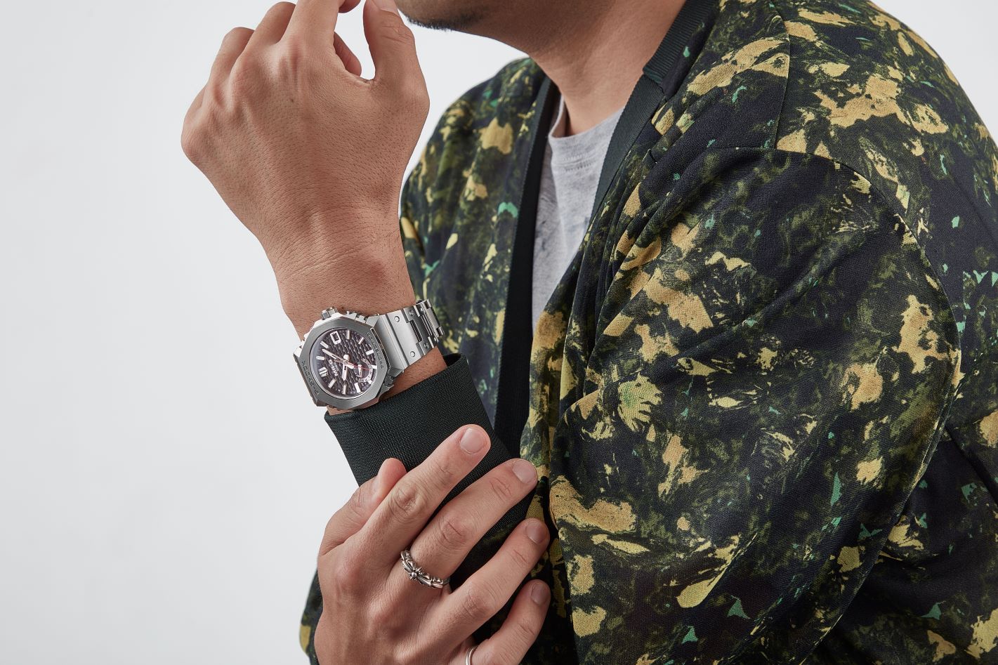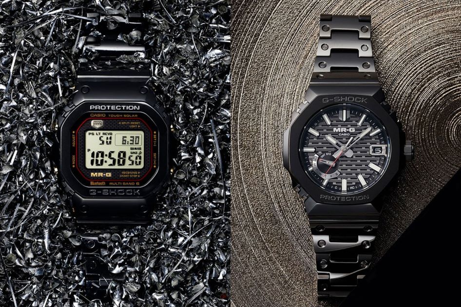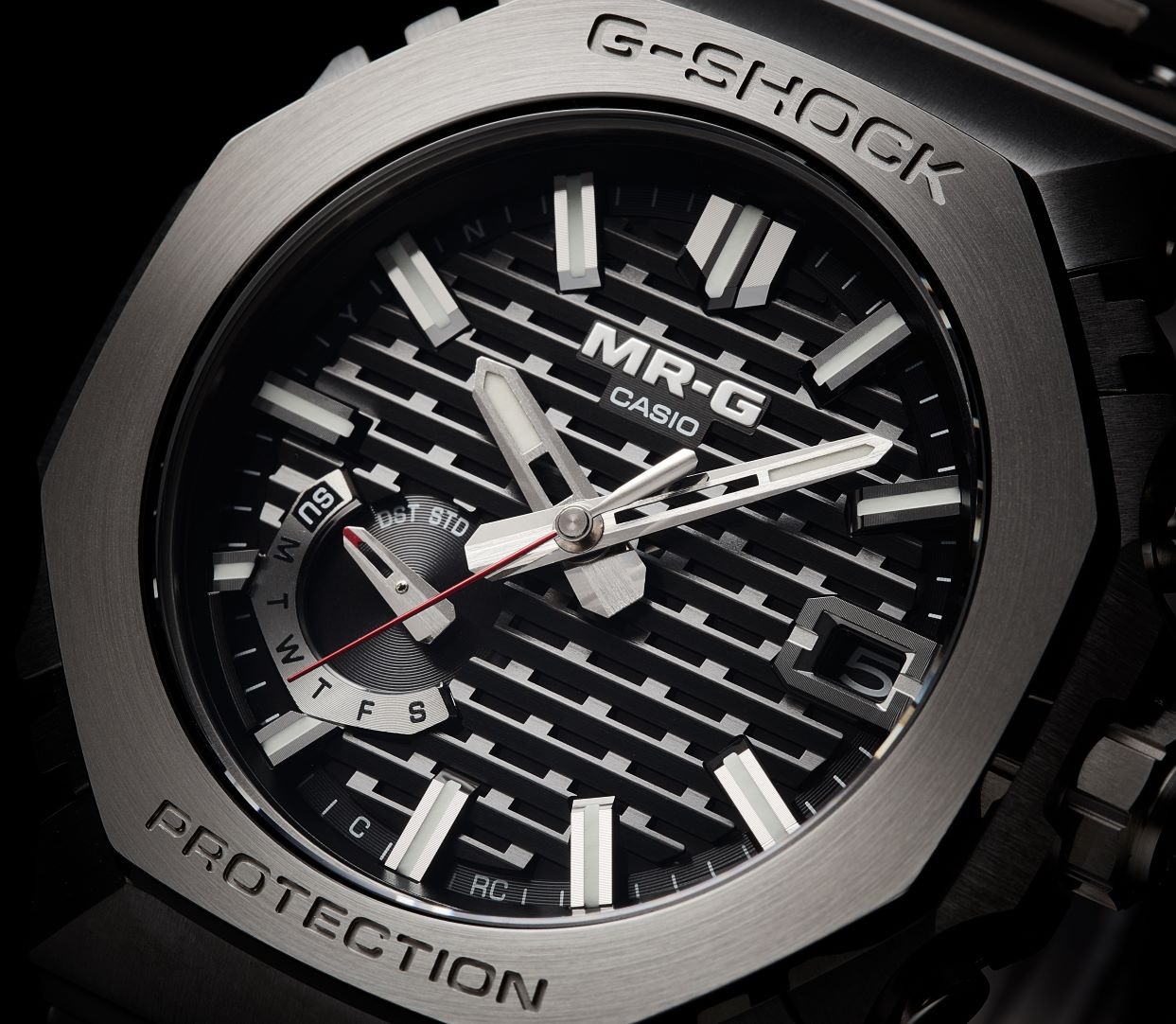 新产品特点主要有两个。第一个特点,受日本传统工艺——木组(kigumi)的灵感启发而设计的表盘。结合波纹状的样式,呈现出类似木格拼接的图案,还通过着色金属质感的黑色,展现出MR-G特有的高级感。此外,表面上一系列精致的镂空设计让足够的光线透过表盘,以便充分吸收太阳能动力所需的光线。这确实是一个兼具美学和实用性的成功设计。另一个特点是已经成为MR-G象征性材料的COBARION(钴铬合金),继前作MRG-B2100B之后,同样被用于MRG-B2100D的表圈。