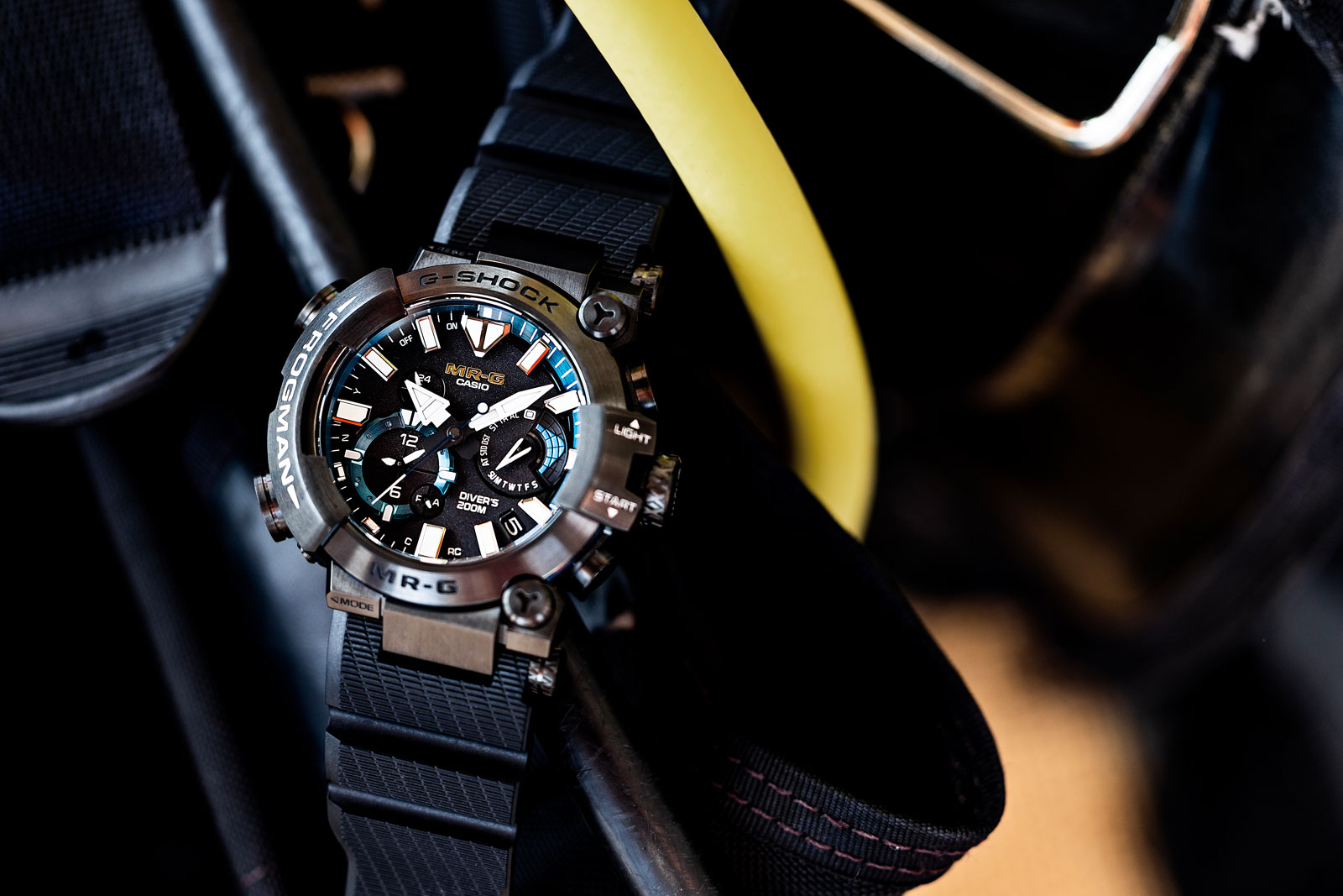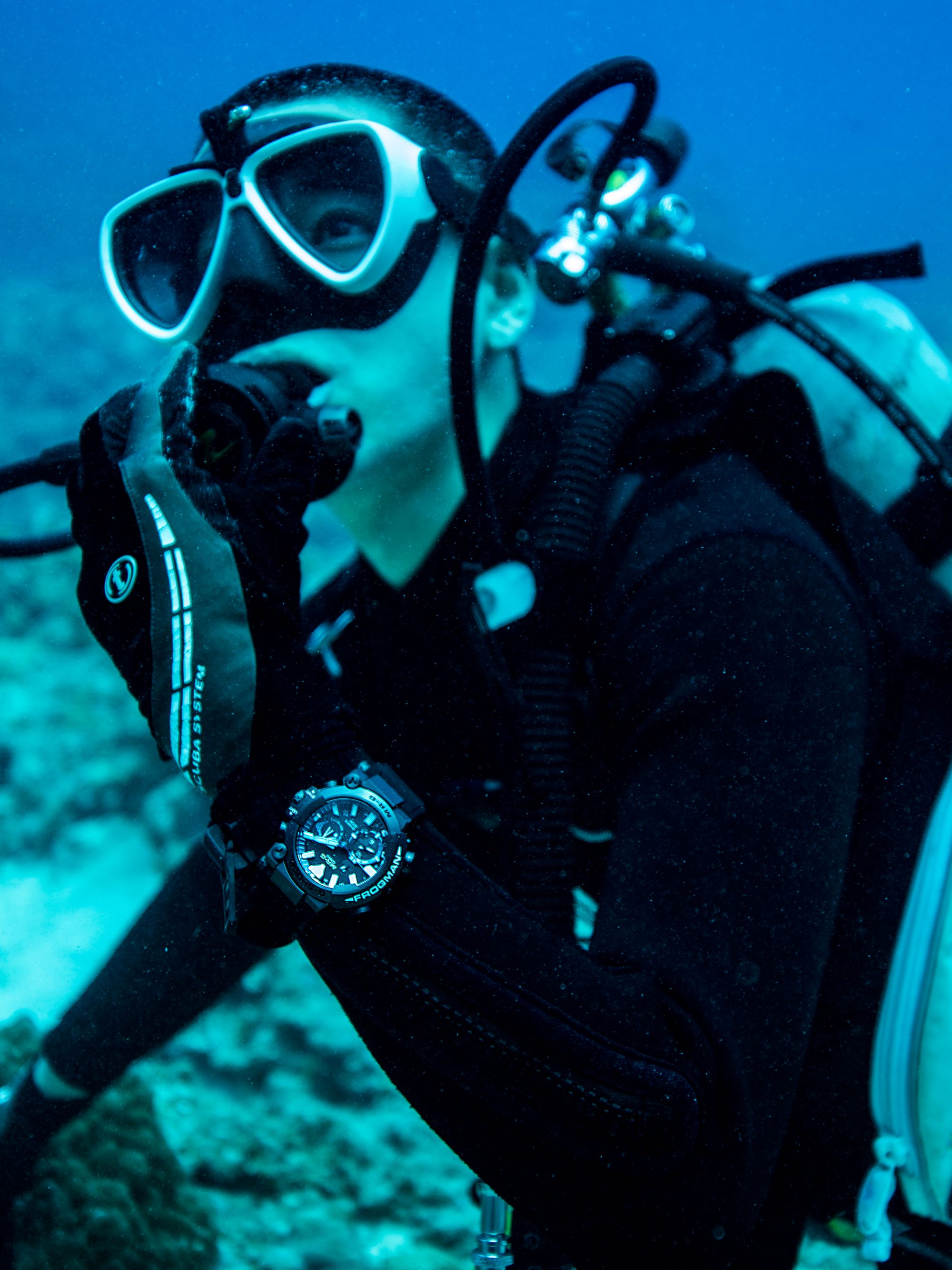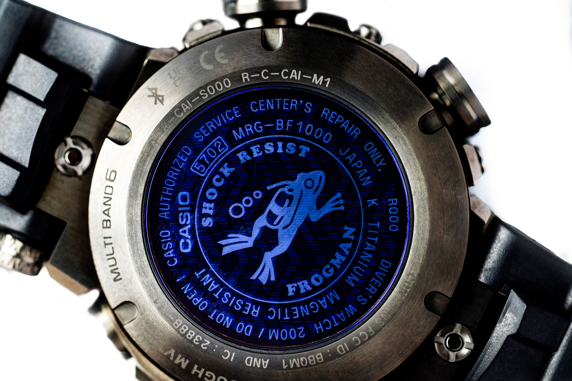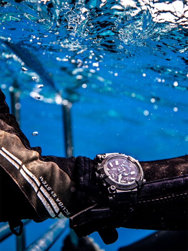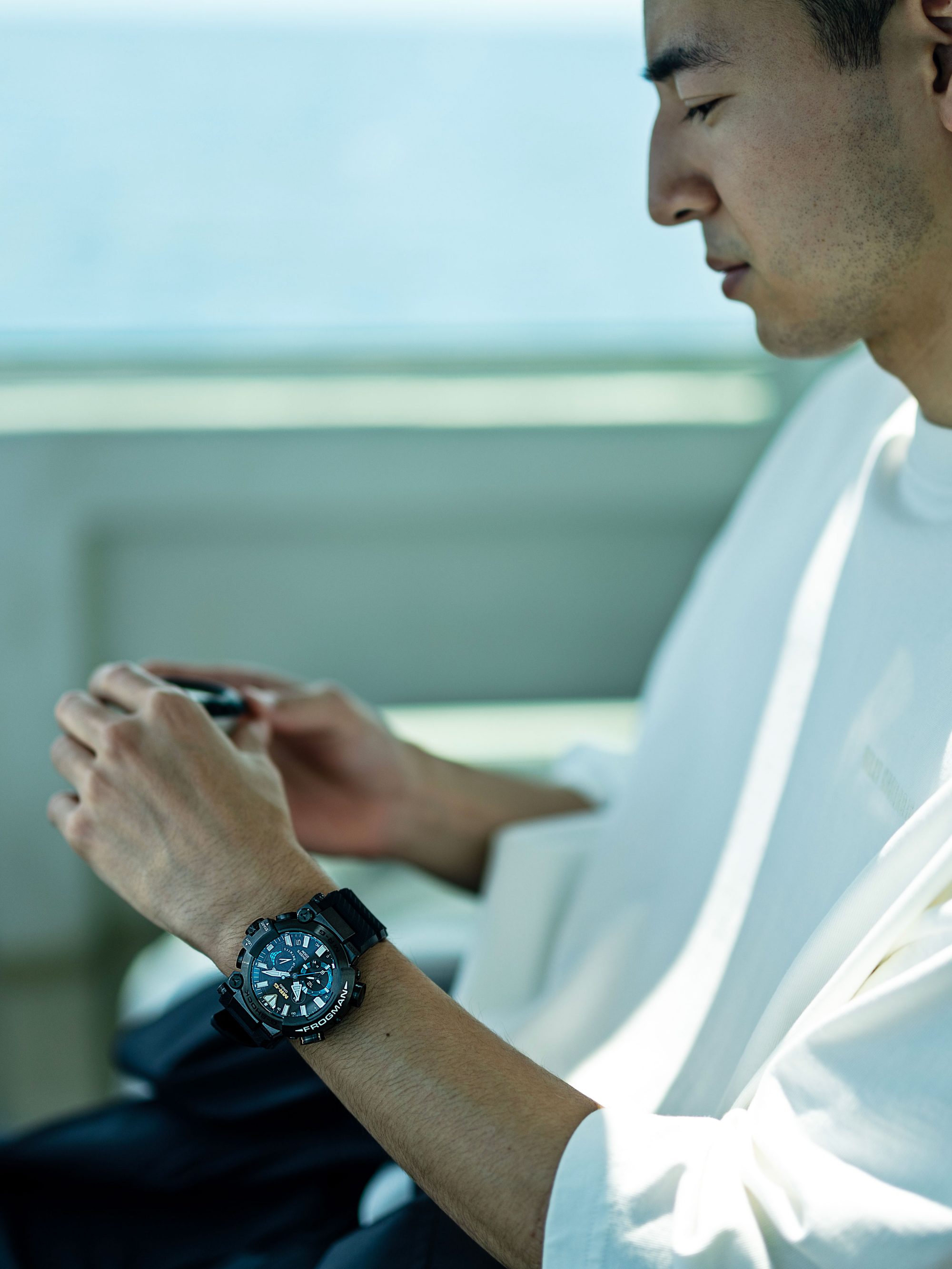 如今,Frogman已成为代表G-SHOCK的珍贵收藏之一。然而,回溯30年前,最初的G-SHOCK开发团队成员、现任CASIO总裁CEO兼CHRO増田裕一先生,为Frogman系列的构想贡献良多。而初代Frogman的设计责任则落在石坂真吾先生肩上,同样他也是最新作品MRG-BF1000R的设计者。螺旋形的蓝宝石玻璃底盖下,数字样式的波纹纹路上,浮现着与初代Frogman所印刻的同样青蛙形象。对于这个设计理念,石坂先生欣然道:“在重新制作MR-G的标志性款式时,我对初代模型充满敬意。设计初代模型是我的工作,但重新对待自己的设计确实有些奇特。”尽管如此,正是这份对初代设计的敬重,将30年前的创新理念延续至今日,获得持续的高度认可。Frogman已融入MR-G的系列阵容,达到前所未有的高度,而这种对挑战恶劣环境的态度也将持续下去。正是这种态度在腕表中得以体现,使得Frogman持续受到专业人士青睐,愿意在恶劣环境下一试身手。