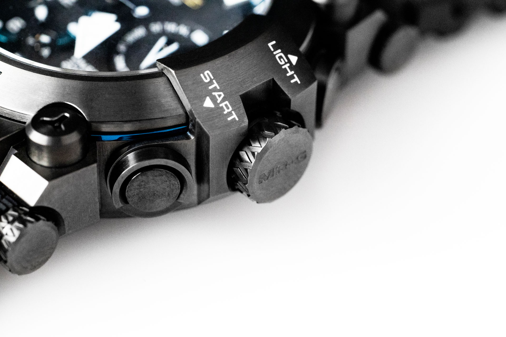 通过激光焊接固定中央机壳和表圈、螺纹锁定式表冠和螺纹背盖,MRG-BF1000R实现了符合ISO 200M潜水防水标准的性能。除了卓越的防水性能,这款腕表另外引人注目的功能之一是完备的模拟潜水模式。按住左下角按钮2秒以上,模式即可启动。潜水过程中,时分针会重叠,以方便测量已过去的潜水时间。由于时针和分针较大,重叠时移动不会让人误解过去的时间。浮出水面后,时分针会逆转,测量出间隔时间(休息时间)。此外,高亮度LED照明功能确保在黑暗的海底环境中仍然能够清晰可见,这对于潜水员而言至关重要。