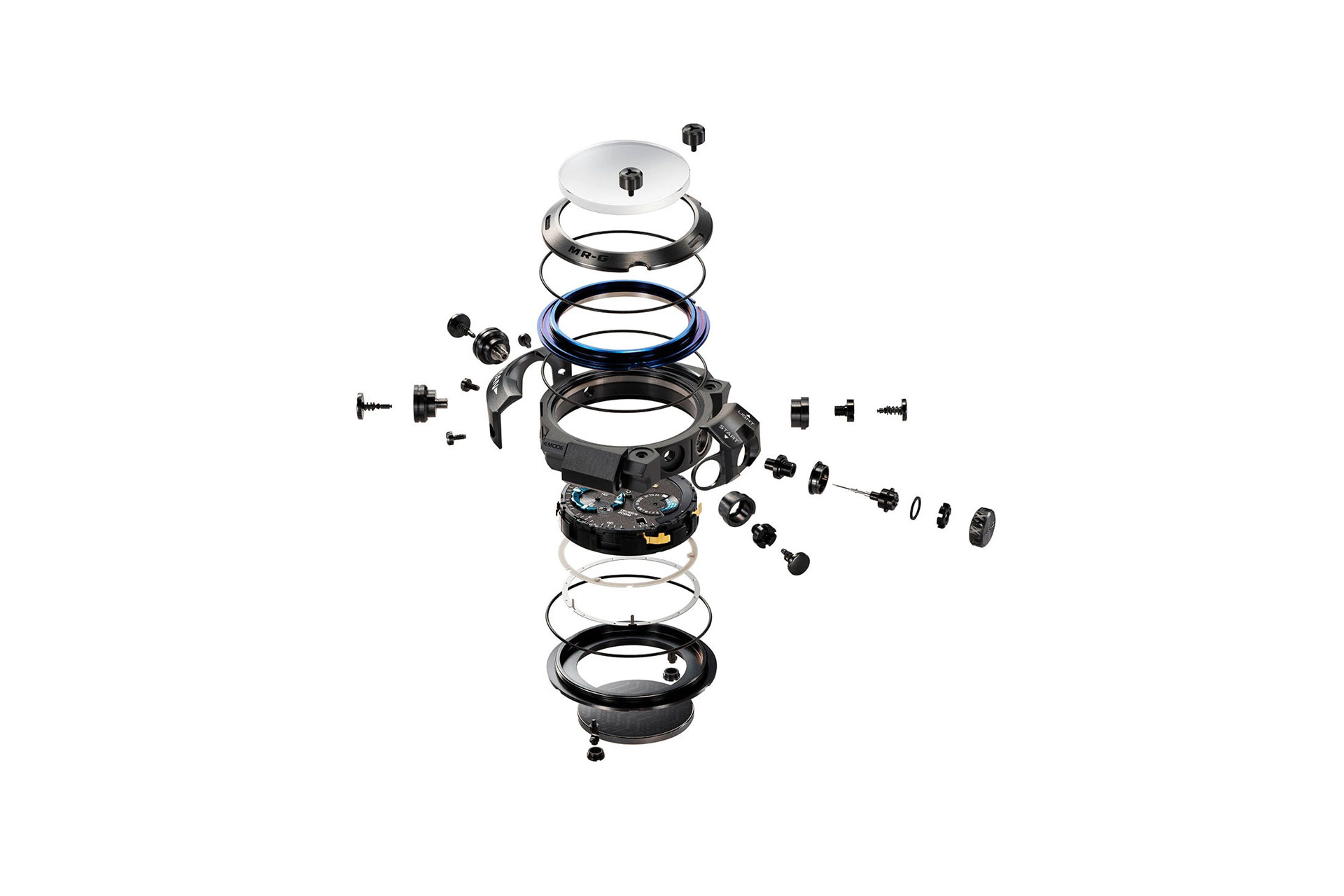 而这款型号的最大特点在于,超越了MRG-B5000外壳零部件数量。为了实现适合MR-G的精美外观,外壳零部件被拆分为多达76个部分,其中包括缓冲材料。从较大的部件如表圈,到每个螺丝、按钮,每一部分都经过精心打磨以适应其独特的形状和尺寸。外壳的双重硬化处理也是在拆解部件的情况下进行,制造过程需要极大的时间和精力。特别值得一提的是,3点和9点位置的保护罩设计曾让人们经历不少挑战。这些部件既需要足够的强度以保护玻璃和主体,又要避免过厚破坏了Frogman的独特外观,同时也不可忽视美感的影响。通过在缓冲材料间创造出薄而立体的形状,CASIO在雕琢过程中付出了巨大的努力。然而,正是因为不妥协的开发,才使得这款具备出色性能和奢华外观的MR-G名副其实,成为了与Frogman相称的潜水腕表。