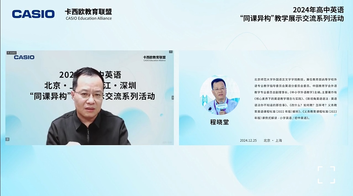 2024年12月25日,由卡西欧(中国)贸易有限公司“电子教育”教师中心主办的高中英语“同课异构”教学展示交流系列活动在上海市上海中学和北京市清华大学附属中学隆重举行。基于“人与自我”主题语境下的“追求与挑战”话题的教学探索,两校开展了两节精彩的英语课堂,展示课不限年级、不限课型。“电子教育”教师中心微信小程序专家讲堂进行同步直播。