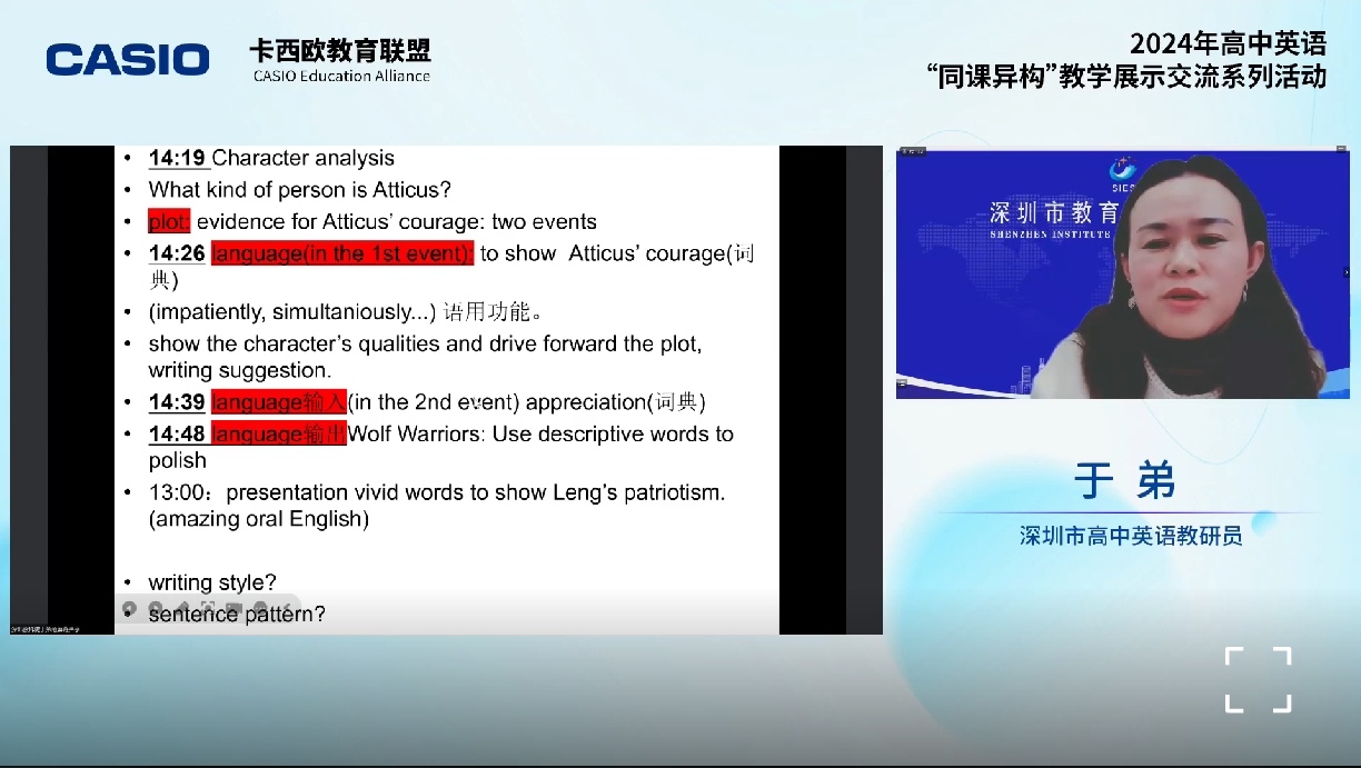 深圳市教育科学研究院高中英语教研员于弟老师提到上海中学是一节融合课内与课外阅读的课。课程中,方老师通过AI智能体引导学生阅读,并在第二部分聚焦于人物分析。课程的输出部分是让学生利用电子辞典查找名人墓志铭,并撰写和加以润色,这一设计巧妙地结合了文章的结束点。同时进一步强调了整本书阅读的重要性,以及如何通过阅读来培养学生的语言技能,认为这是一种真正的学习方式。
