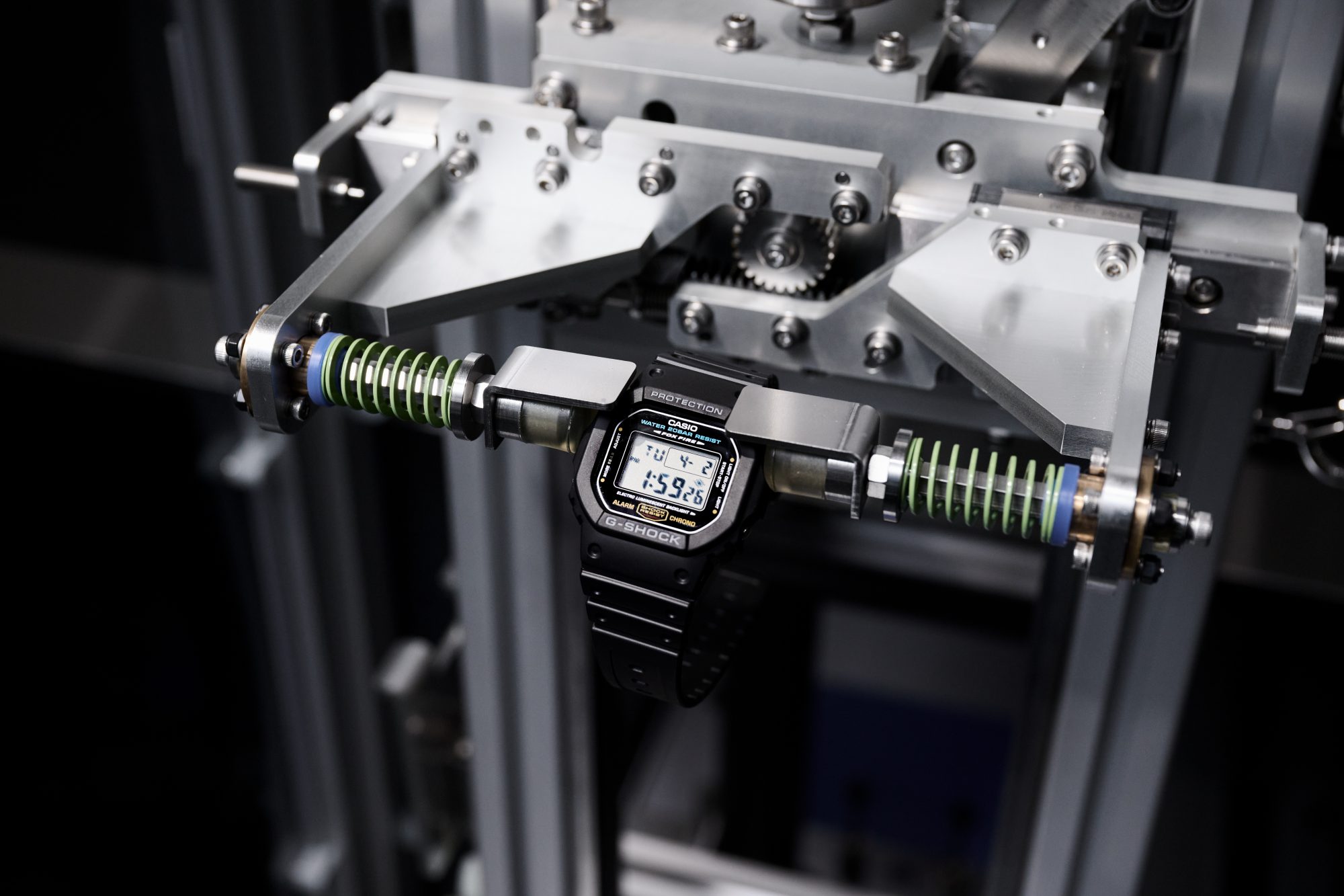 约5公斤的锤子进行手表本体的冲击试验,通过泵送空气再现水深200米的环境进行气密性和耐压性能的测试,以及利用弹簧进行的加速试验,体验比自由落体更强的耐冲击性能的测试。