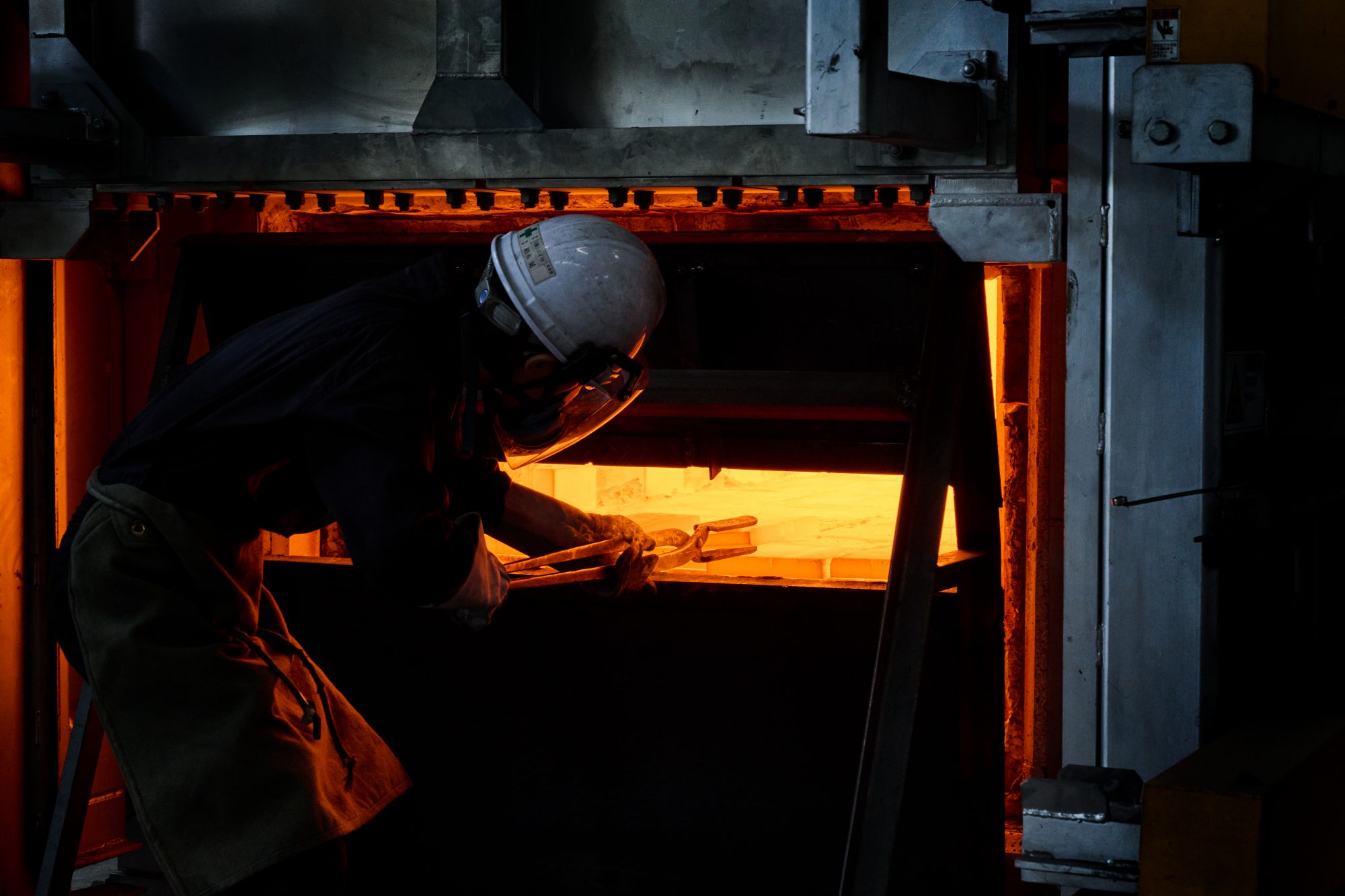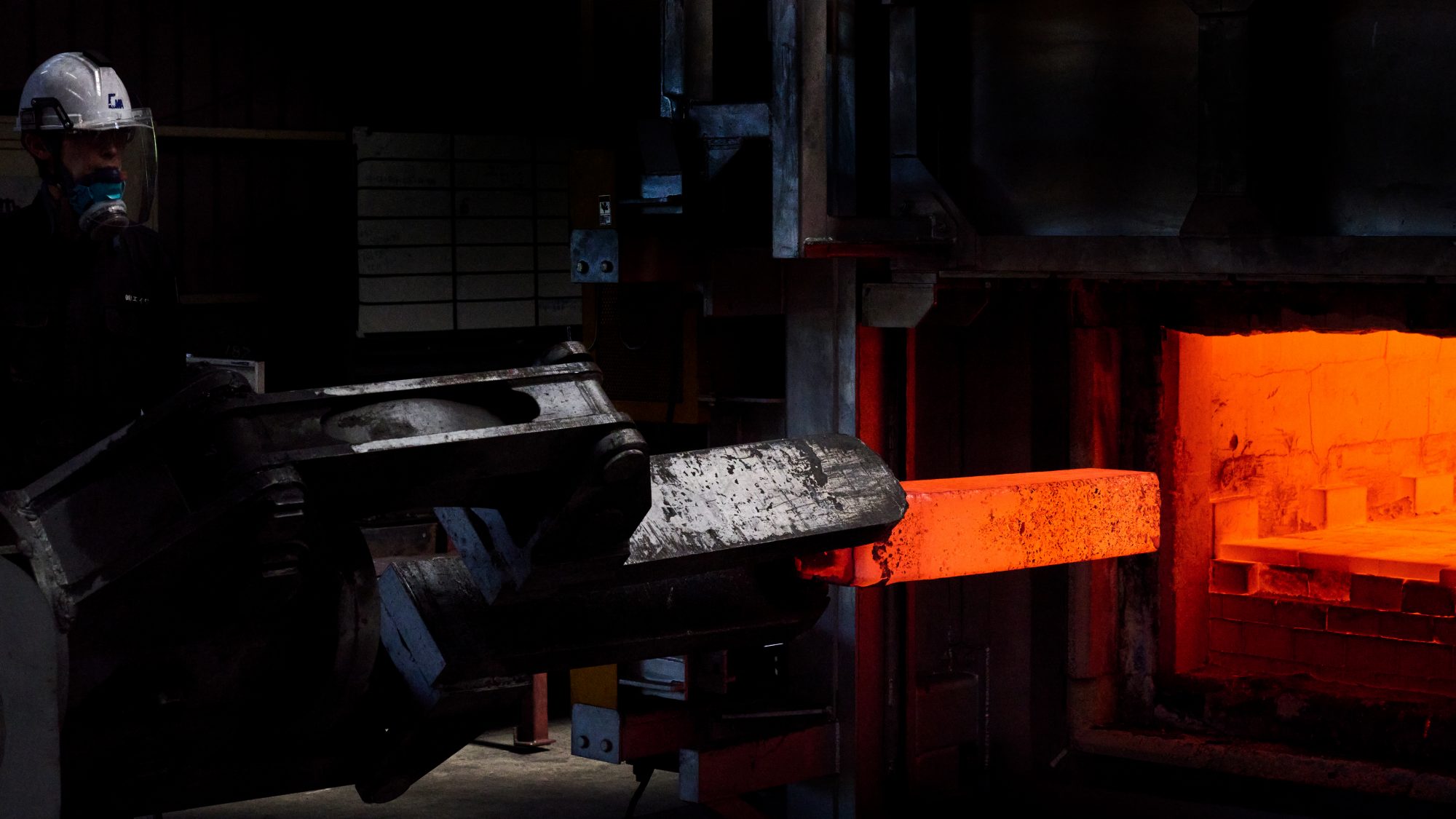 现在形成的铸锭再次被加热到 1000°C以上。然后,为了增加其硬度,使用一台 600 吨的液压机反复击打和压缩它们,火花四处飞溅。为了防止材料开裂,锻造过程中的温度控制和冲压次数都经过细致调控。