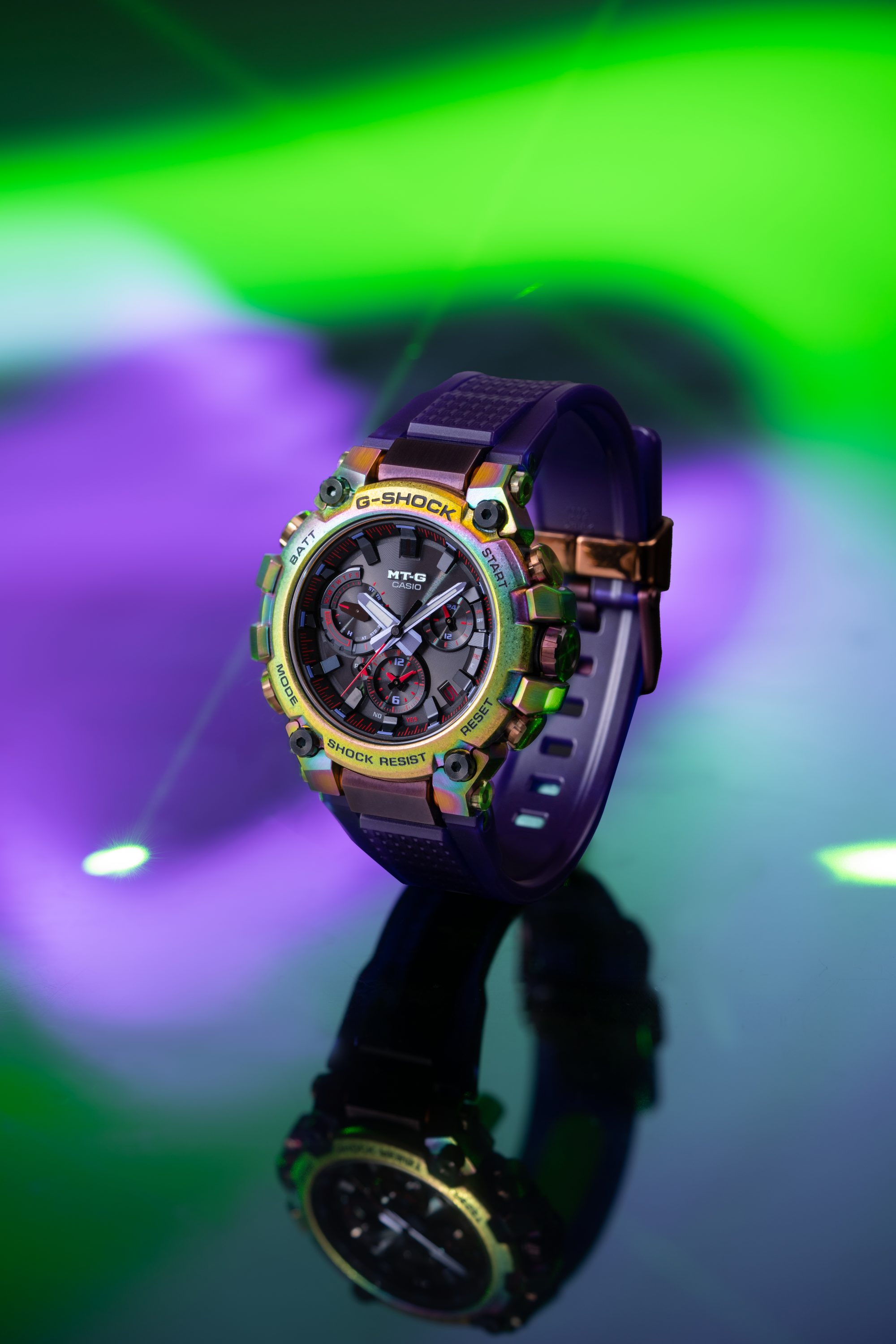 造型华丽的底盖采用侧边凸起设计,与顶部表圈紧紧互锁,形成深邃而又细致入微的金属外观。一体模塑技术,结合反复锻造、切割和抛光工艺,显著提升整体硬度。不仅如此,材料表面还融入了彩虹IP涂层,同时利用再抛光工艺除去底盖上凸起部分的涂层,打造姿态各异的饰面效果。这种独特的设计技术与金属本身的光泽相辅相成,形成五彩斑斓的变幻效果。