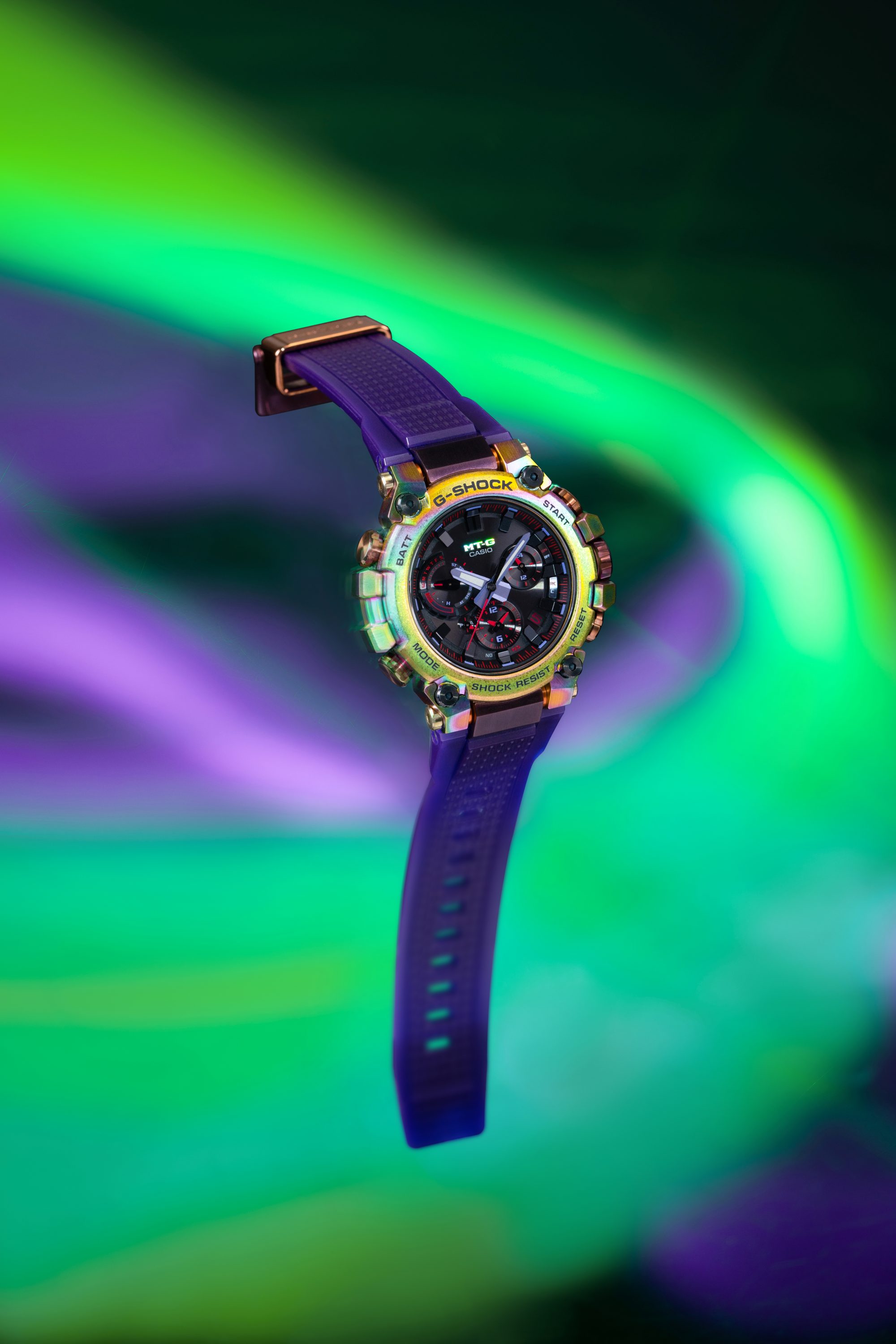 不锈钢表圈首先经过重结晶和深层硬化处理,在材料表面形成坚硬的表层,产生瑰丽斑斓而又姿态各异的外观纹理。之后在表面上融入彩虹IP涂层,代表着从外太空看到的绚烂北极光。如此绚烂精美的外观,尽显品牌对材料、色彩和饰面等诸多设计元素的不懈追求。