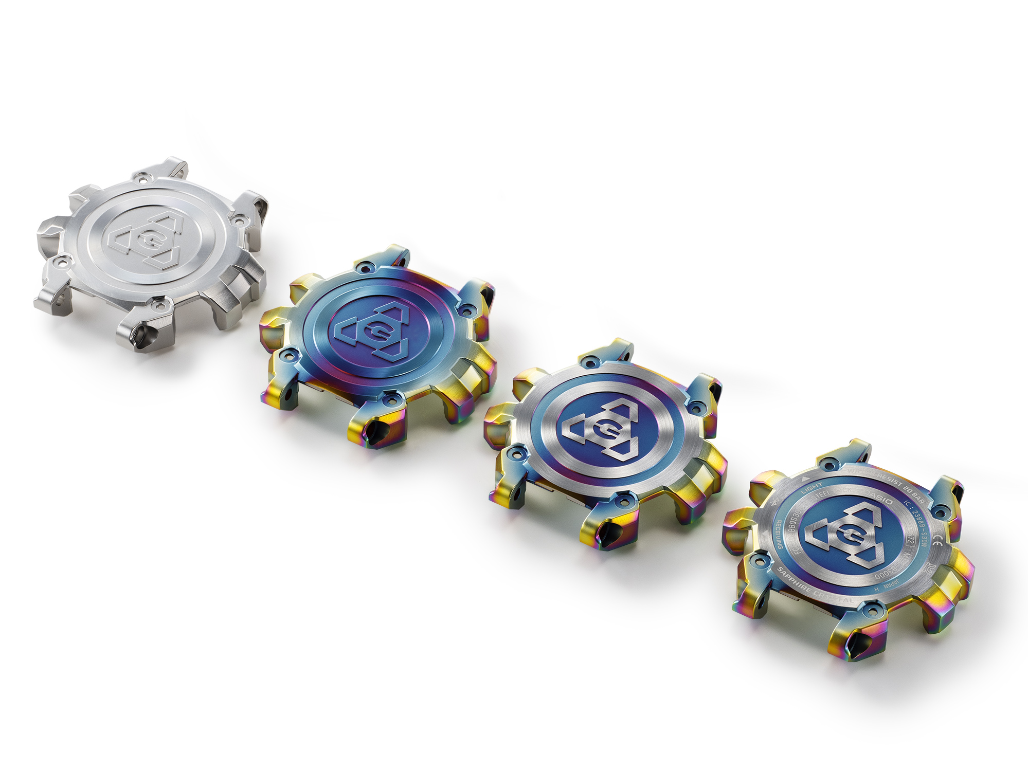 造型华丽的底盖采用侧边凸起设计,与顶部表圈紧紧互锁,形成深邃而又细致入微的金属外观。一体模塑技术,结合反复锻造、切割和抛光工艺,显著提升整体硬度。不仅如此,材料表面还融入了虹彩离子镀涂层,同时利用再抛光工艺除去底盖上凸起部分的涂层,打造姿态各异的饰面效果。这种独特的设计技术与金属本身的光泽相辅相成,形成五彩斑斓的变幻效果。