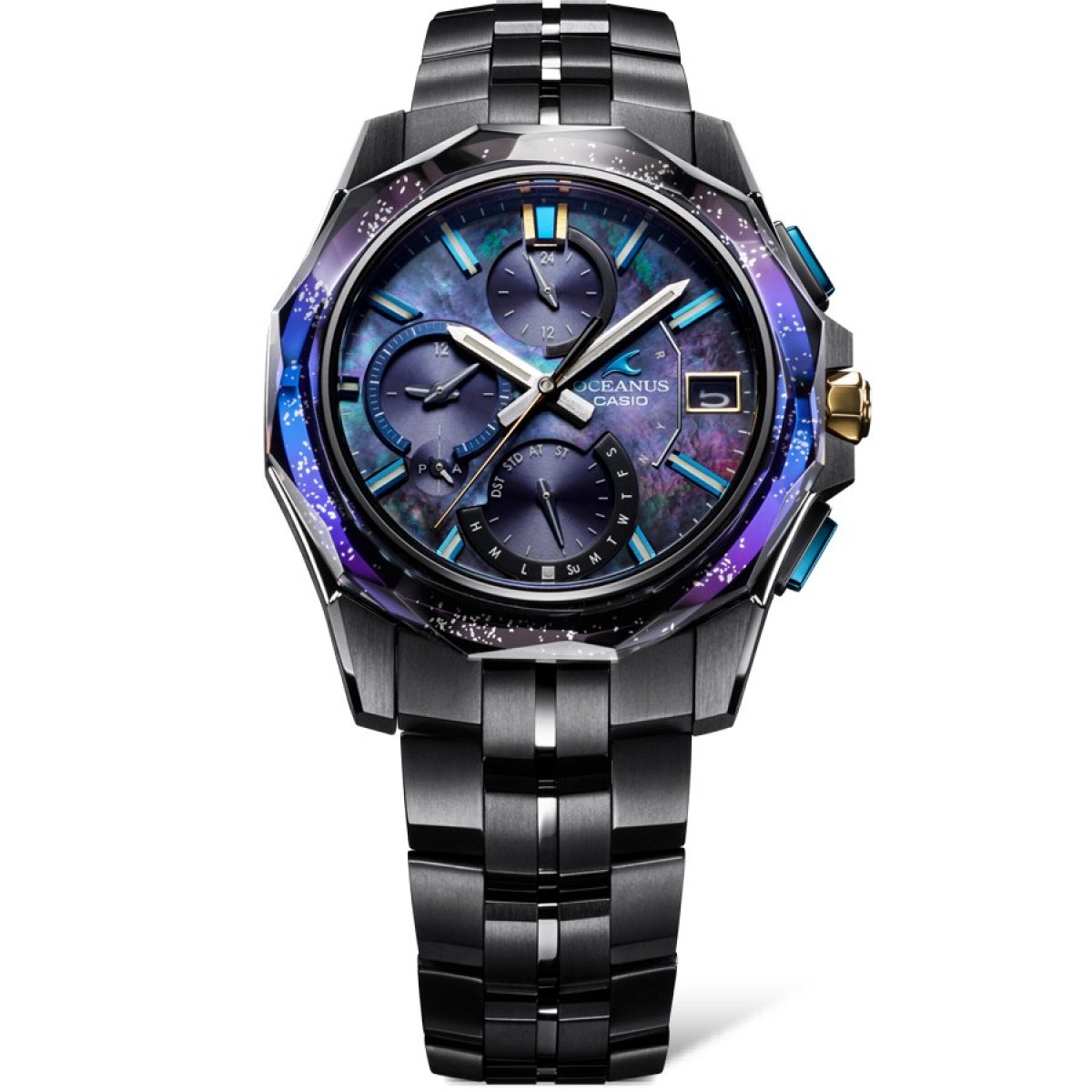 OCEANUS Manta系列的OCW-S6000BV,以追求功能与美学的极致结合为目标,设计灵感来源于波涛汹涌、暗潮涌动的辽阔海洋。手表的表圈采用蓝色渐变至黑色的镀膜处理,并结合了两种切割方式的24面切割人造蓝宝石玻璃。表盘为美丽的白蝶贝表盘并采用黑色处理,使得这款手表在休闲风格中又不失优雅,更有一丝神秘感。