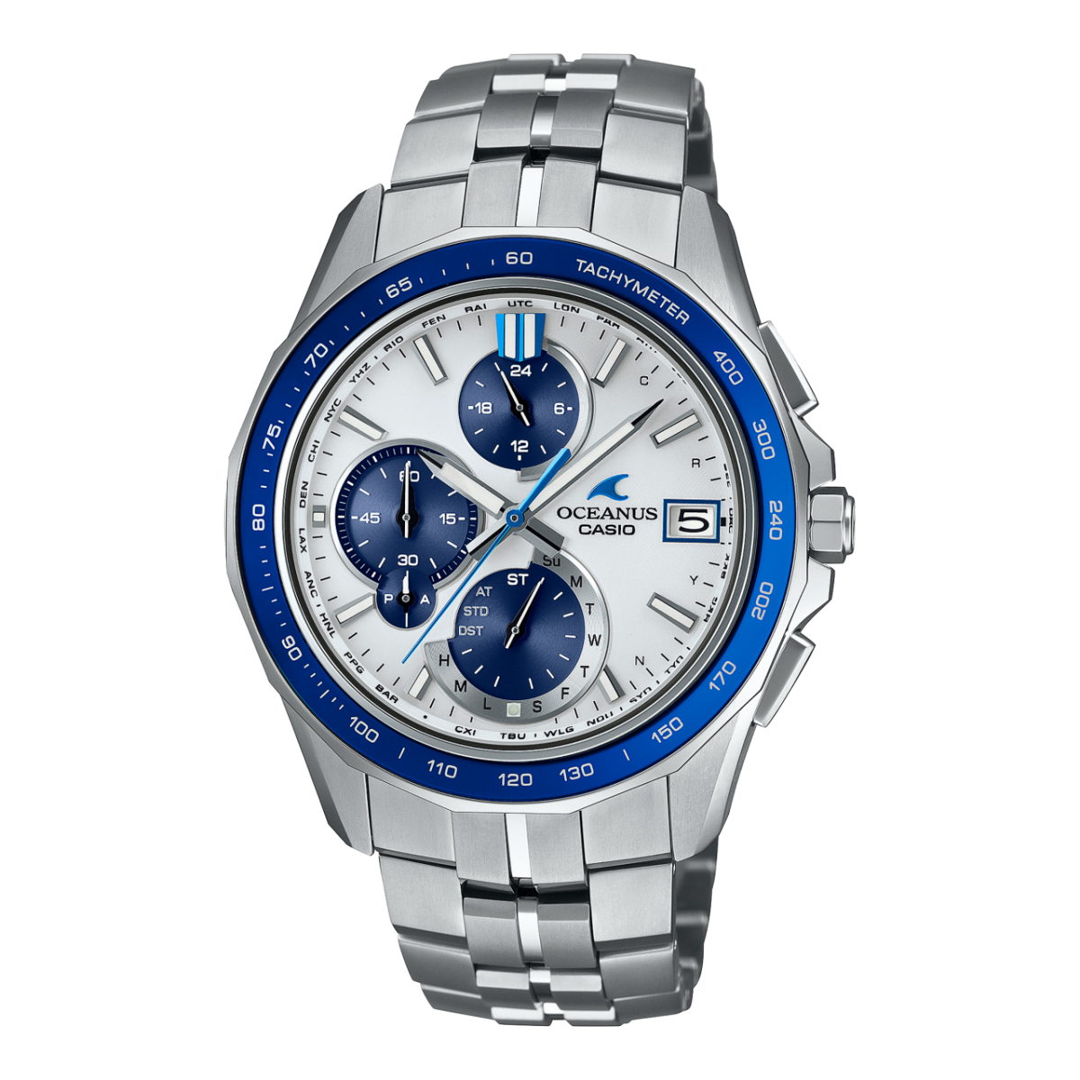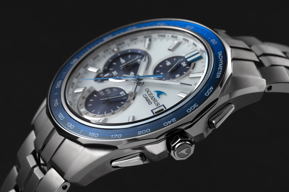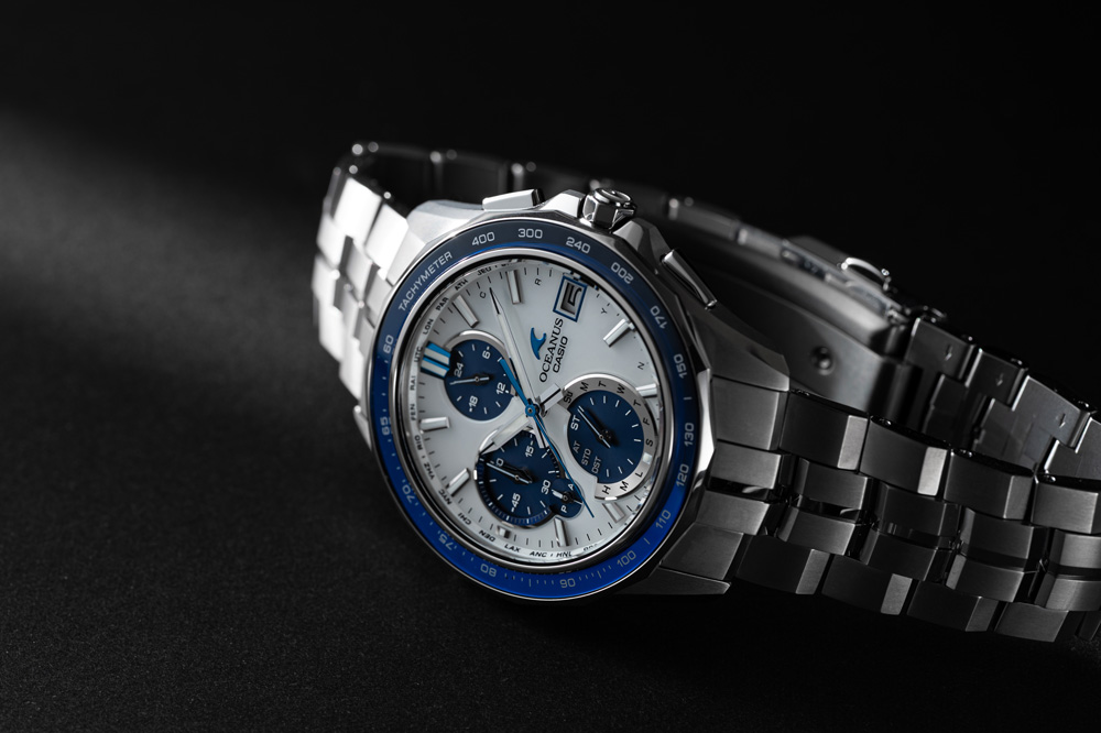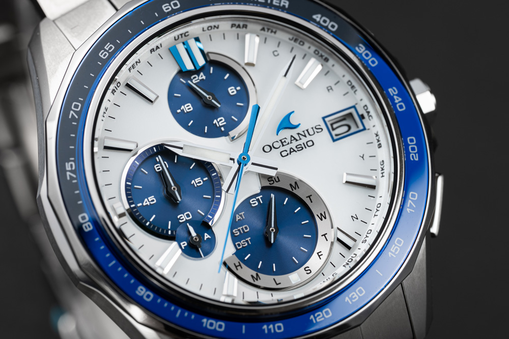 首次在 OCW-S7000 系列中引入了副表盘太阳能动力技术,且保持了同样的充电量。同时使得主表盘的透光率不再受到限制,得以使用独特的着色技术。表盘以不透明的白色为底,表面覆以银色镀膜和哑光处理,搭配透明的蓝色副表盘,深邃的海神蓝与明亮的白色形成鲜明对比,展现出青春与活力。