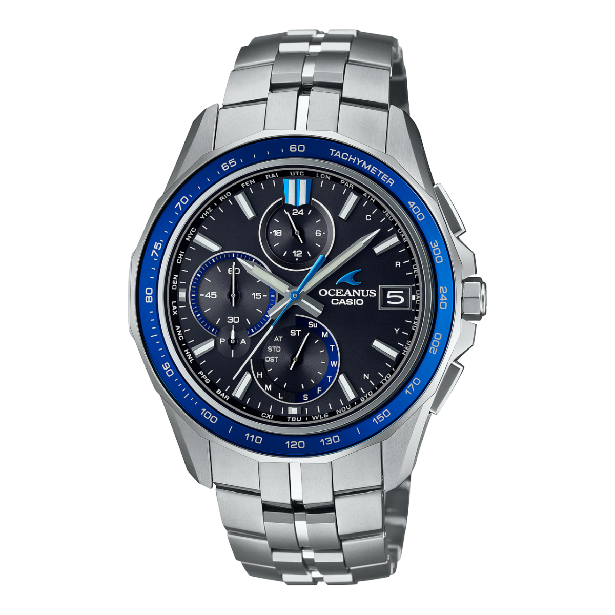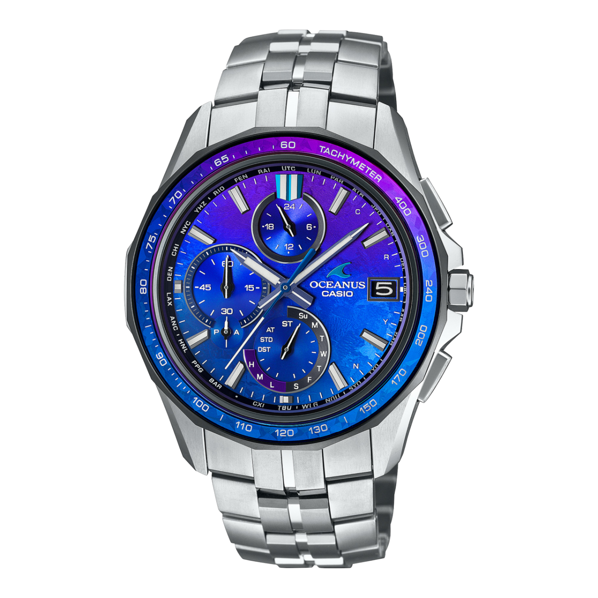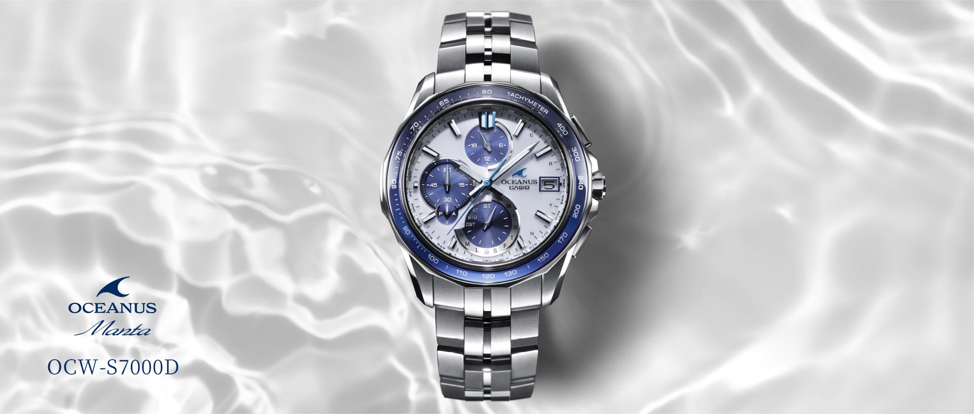 首次在 OCW-S7000 系列中引入了副表盘太阳能动力技术,且保持了同样的充电量。同时使得主表盘的透光率不再受到限制,得以使用独特的着色技术。表盘以不透明的白色为底,表面覆以银色镀膜和哑光处理,搭配透明的蓝色副表盘,深邃的海神蓝与明亮的白色形成鲜明对比,展现出青春与活力。